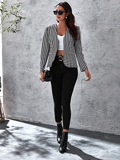 Feature: Long Sleeve, Open Front, Houndstooth Print, Pockets, Elegant.